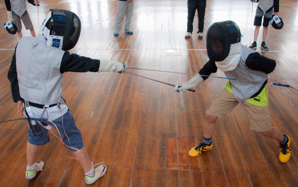 Aujourd’hui focus sur une activité périscolaire : l’escrime, animée par Aoi Narumi et Saki Oshima.