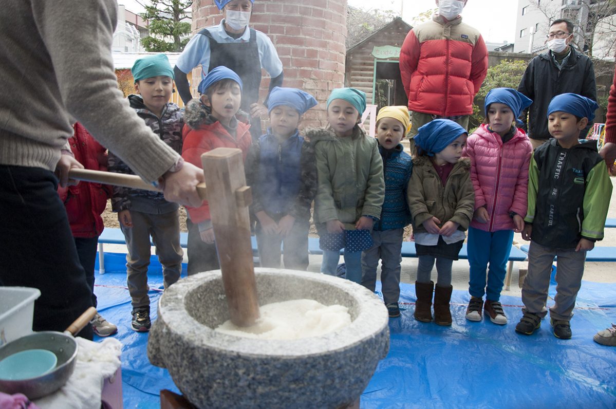 Vendredi 8 janvier, les élèves de maternelles étaient invités par la maternelle Taiken pour le traditionnel ‘Mochitsuki’ 餅つき.