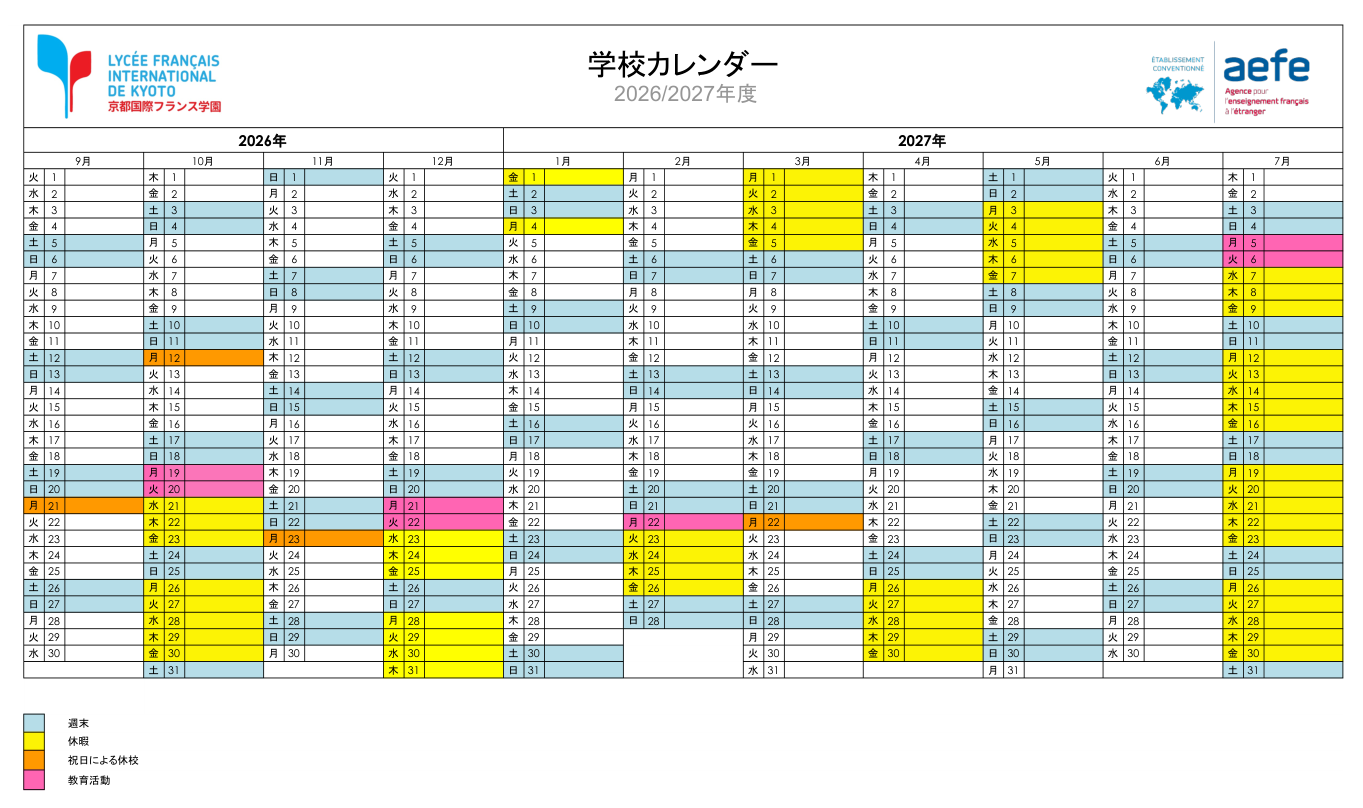 学校カレンダー 2026-2027