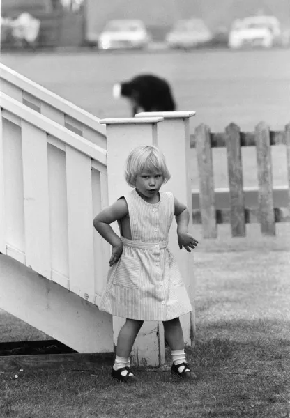 Three year old Zara Phillips, daughter of Princess Anne and Captain Mark Phillips, pictured attending the polo match at Smith’s Lawn Polo Ground in Windsor.Here she is pictured playing peekaboo over the Royal fence. 17th June 1984.