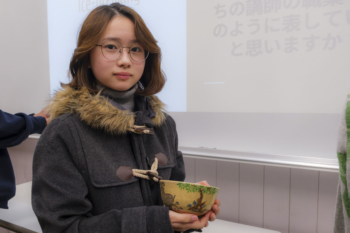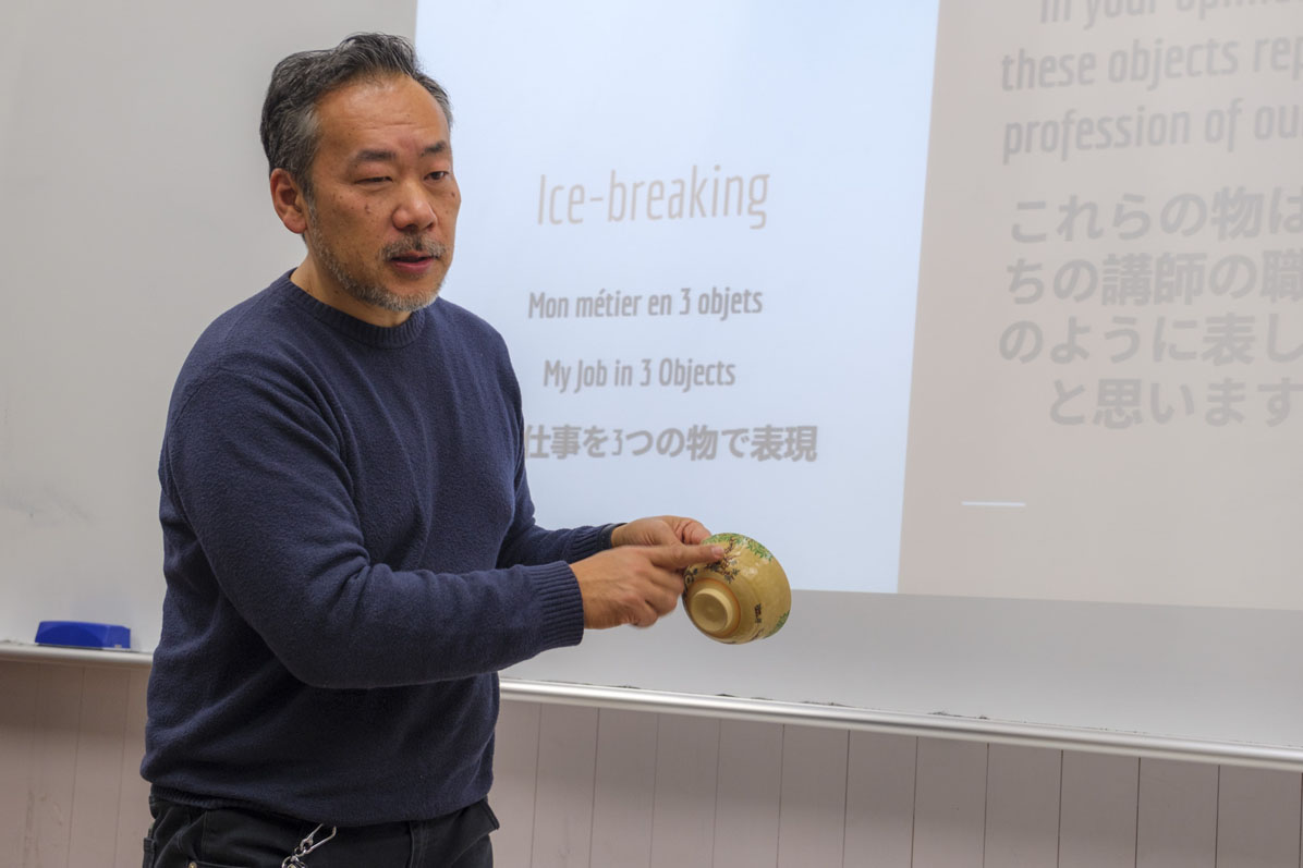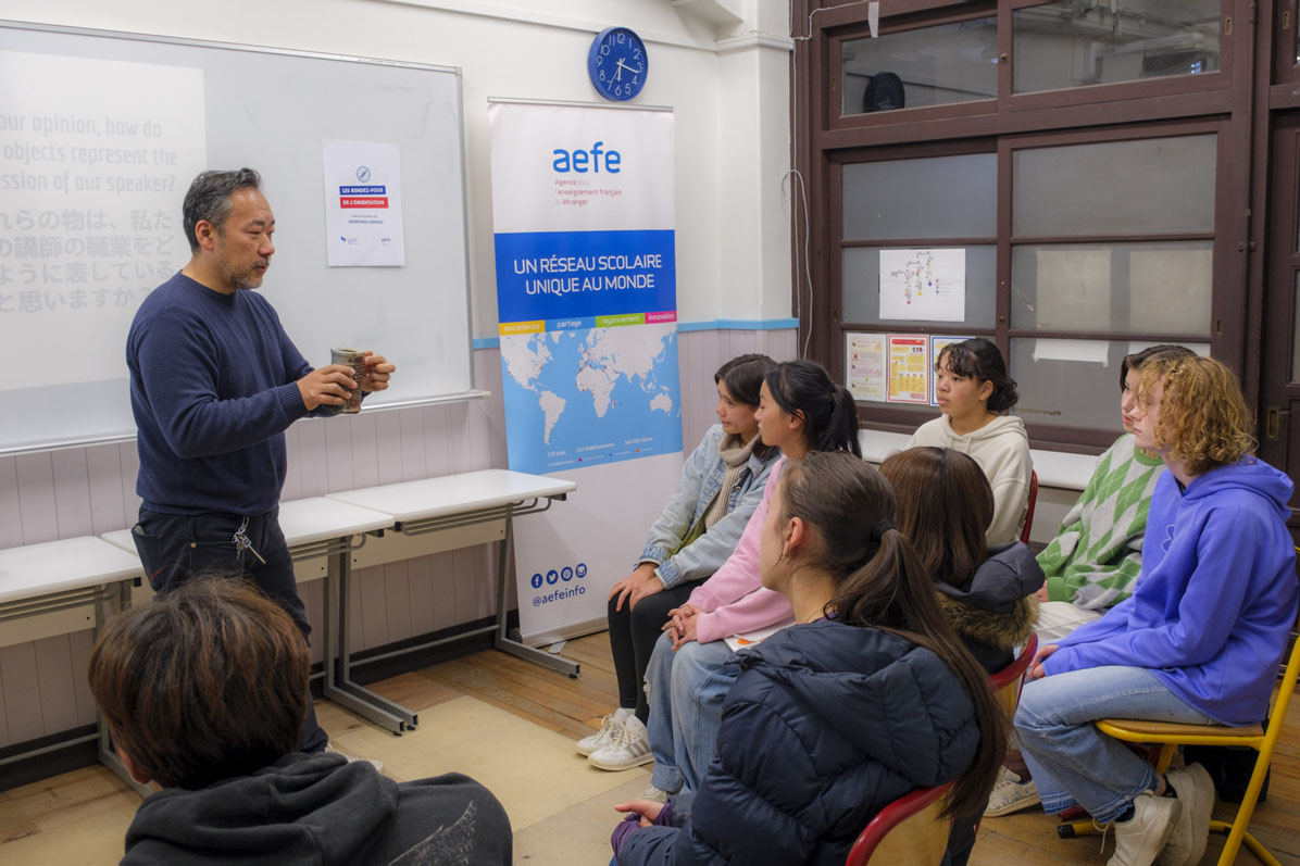 M. Morioka a su captiver les élèves dès les premiers instants en partageant son métier avec une approche des plus dynamiques. Pour briser la glace, il a d’abord proposé un jeu ludique de “2 vérités et 1 mensonge” sur son quotidien de potier, invitant les participants à démasquer l’affirmation fausse avec curiosité et bonne humeur. Trois objets emblématiques, apportés par M. Morioka, ont ensuite catalysé la discussion. Répartis en groupes, les élèves se sont lancés dans un véritable questionnement pour percer les secrets de chaque pièce : démarche créative, choix techniques audacieux et approche artistique singulière.