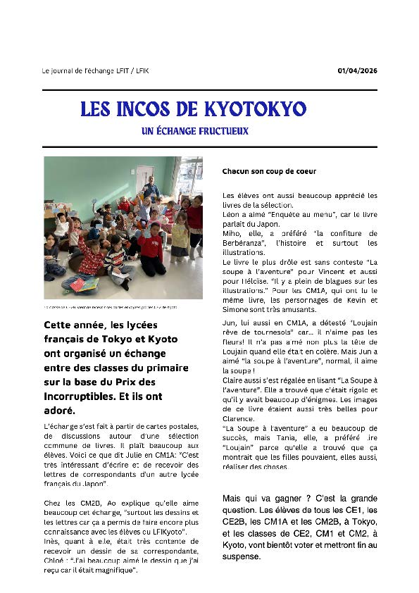 Au programme : mots croisés, rébus, blagues et anagrammes, travaillés en petits groupes au cours de trois séances. Ce projet, mené en collaboration avec Mme Anne Ladouce, professeure documentaliste au LFI Tokyo, a permis de produire un journal complet riche en rubriques (actualités, interviews, BD).
